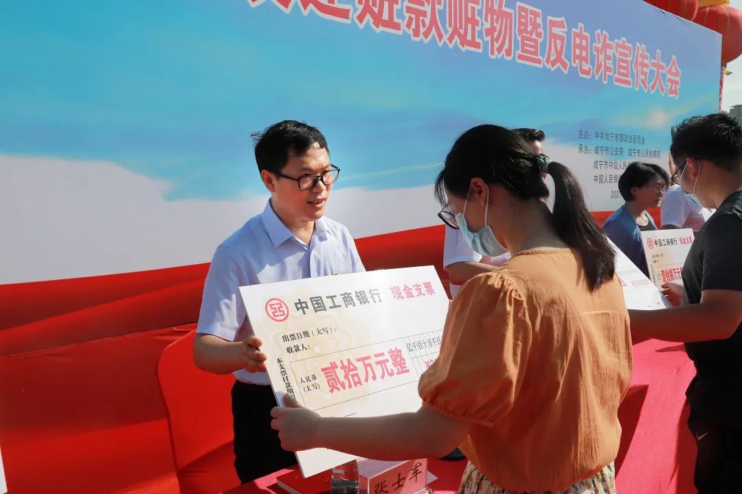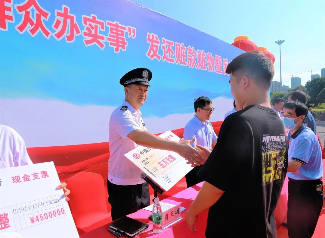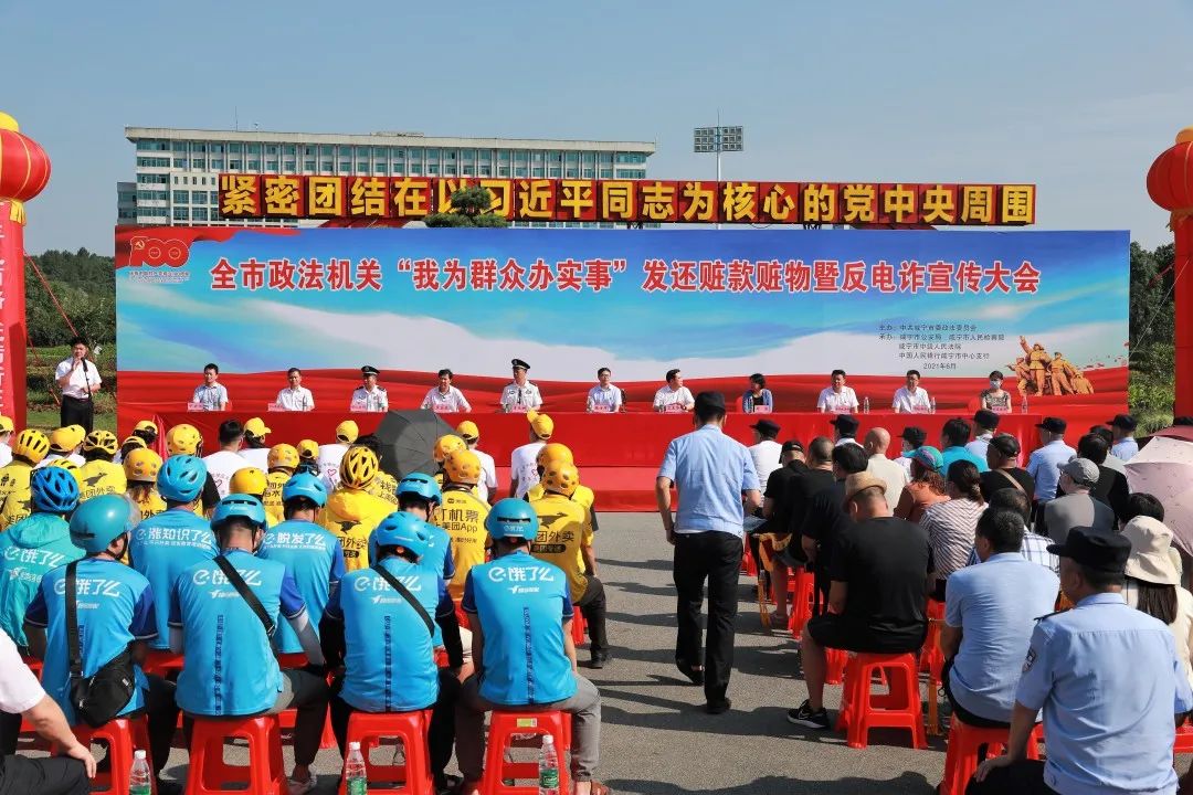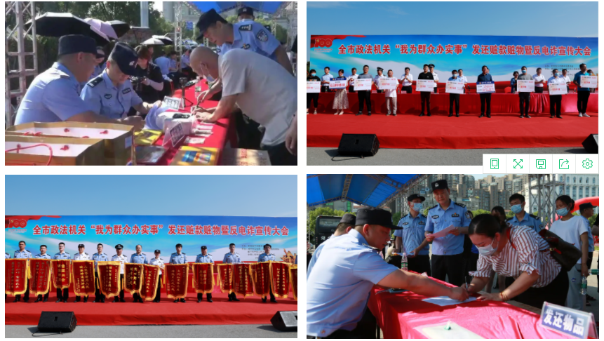 通過此次退贓大會(huì),進(jìn)一步向全市人民展示了咸寧公安扎實(shí)開展“我為群眾辦實(shí)事”活動(dòng)成效,以及嚴(yán)打嚴(yán)防各類犯罪,致力“打防管控宣”,堅(jiān)決斬?cái)嗌煜蛉罕婂X袋子的黑手。
