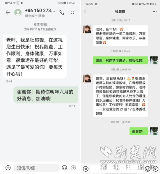 荊楚網(wǎng)(湖北日報(bào)網(wǎng))訊(記者黃錚)“魏爸,生日快樂呀!很感謝老師以前的諄諄教誨,在我想要放棄時的鼓勵、懈怠時的敲打……”11月2日,通城縣一中魏剛老師收到到了這樣一條微信消息。連續(xù)兩年,他都收到了2021屆學(xué)生杜超鋒發(fā)來的生日祝福短信。