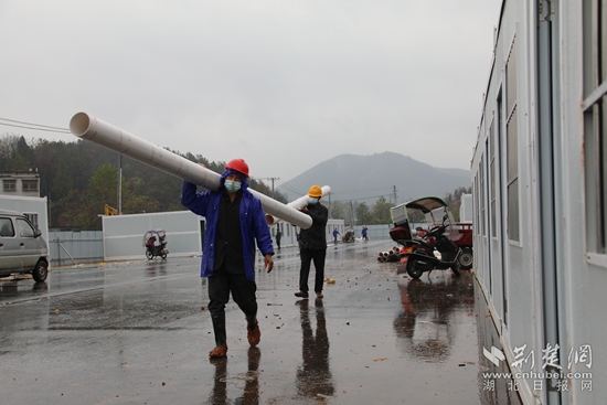 “雨又來了,管道這邊加人、加料,大家加把勁,今天必須完成所有排污管道的鋪設?!?1月29日上午6時,崇陽縣赤通公路旁備用集中隔離點項目建設現(xiàn)場,跟雨點一樣急的是項目A區(qū)負責人劉華豪沙啞的嘶吼。