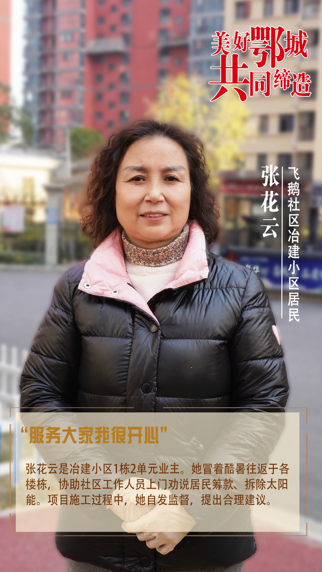 張軍華是冶建小區(qū)1棟2單元8樓業(yè)主。她多次向社區(qū)、住建部門反映小區(qū)房屋漏水問題,同時身體力行,帶頭出資籌款。她每天往返社區(qū)與小區(qū)多次,不厭其煩做鄰里群眾思想工作,深受小區(qū)居民信任。