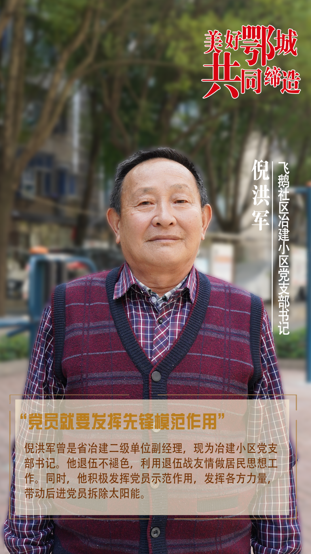 倪洪軍曾是省冶建二級單位副經(jīng)理,現(xiàn)為冶建小區(qū)黨支部書記。他退伍不褪色,利用退伍戰(zhàn)友情做居民思想工作。同時,他積極發(fā)揮黨員示范作用,發(fā)揮各方力量,帶動后進黨員拆除太陽能。