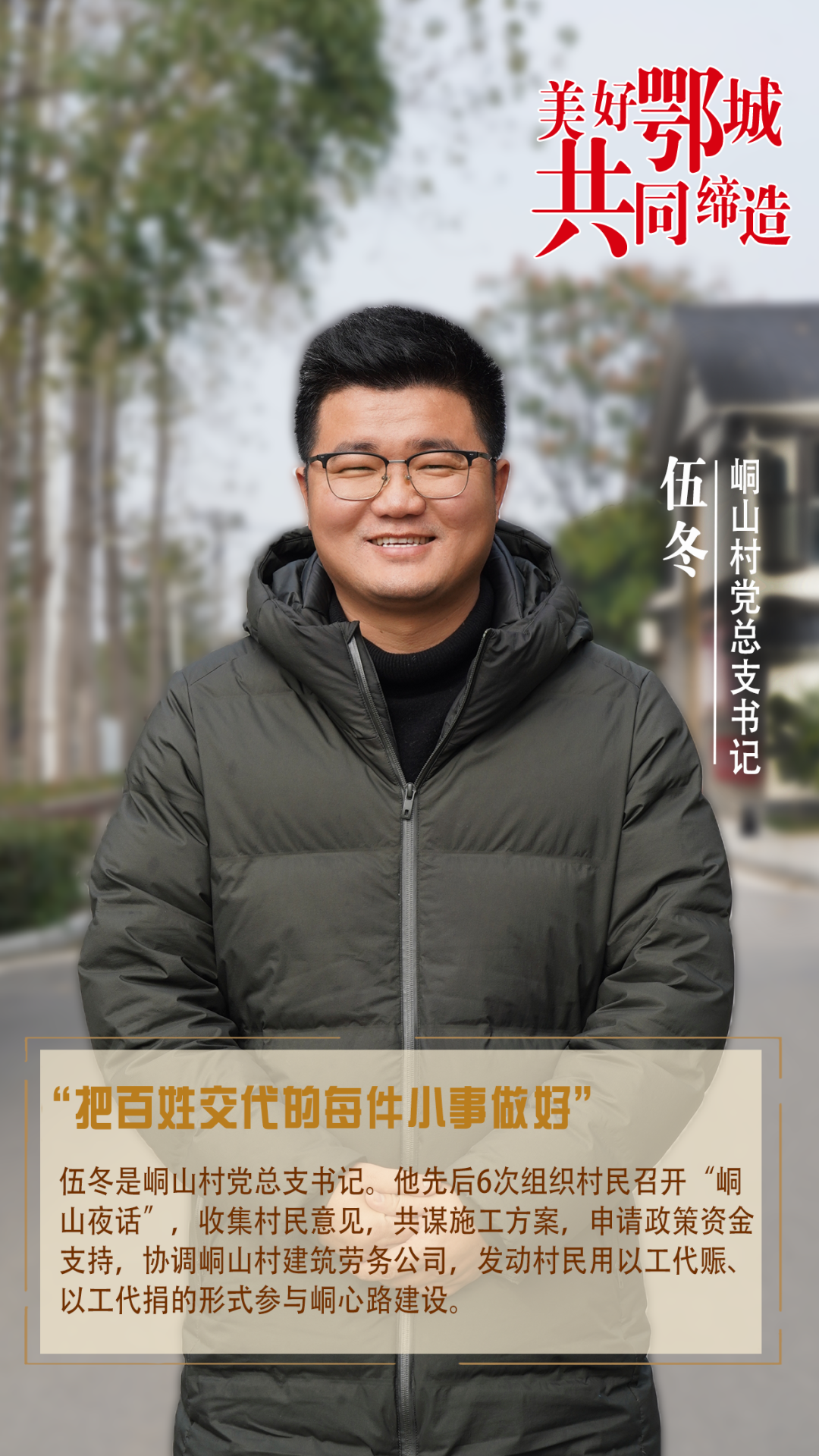 伍冬是峒山村黨總支書記。他先后6次組織村民召開“峒山夜話”,收集村民意見,共謀施工方案,申請政策資金支持,協(xié)調(diào)峒山村建筑勞務公司,發(fā)動村民用以工代賑、以工代捐的形式參與峒心路建設。