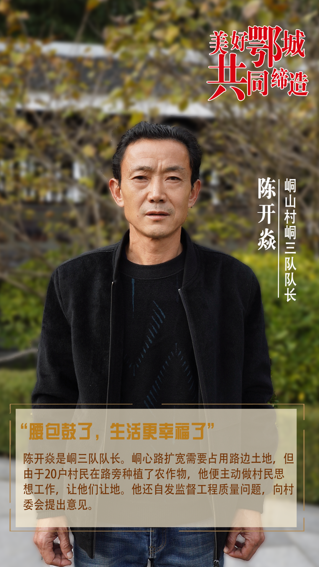 陳開焱是峒三隊隊長。峒心路擴寬需要占用路邊土地,但由于20戶村民在路旁種植了農(nóng)作物,他便主動做村民思想工作,讓他們讓地。他還自發(fā)監(jiān)督工程質(zhì)量問題,向村委會提出意見。