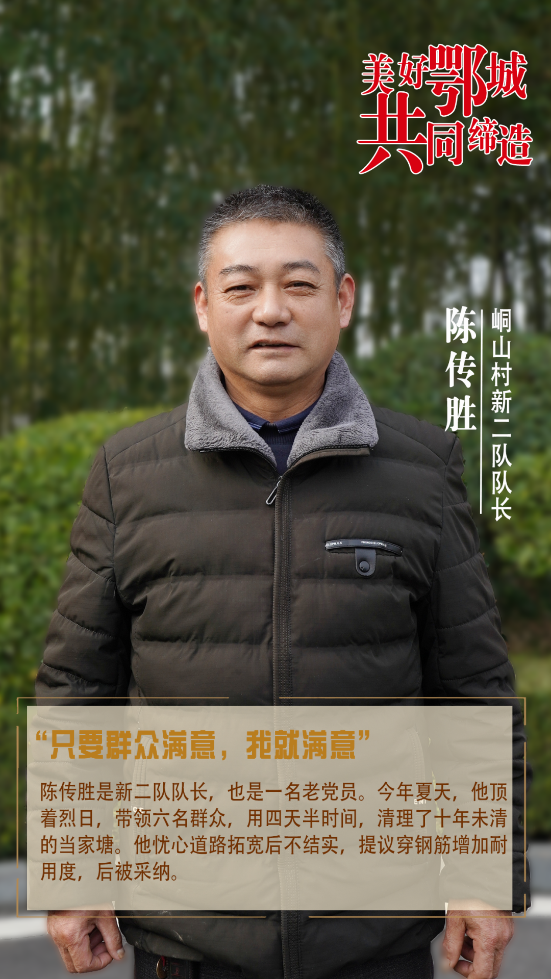 陳傳勝是新二隊隊長,也是一名老黨員。今年夏天,他頂著烈日,帶領(lǐng)六名群眾,用四天半時間,清理了十年未清的當家塘。他憂心道路拓寬后不結(jié)實,提議穿鋼筋增加耐用度,后被采納。