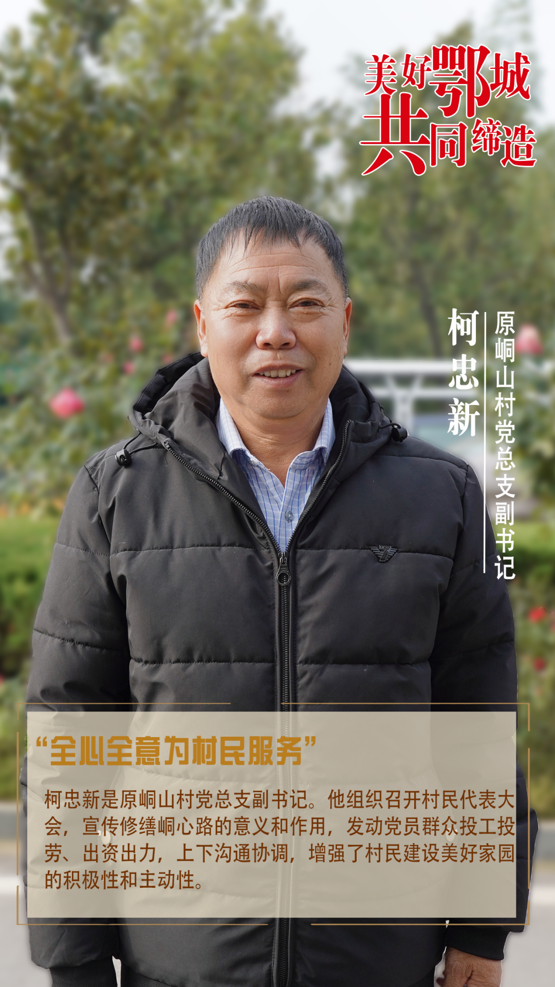 柯忠新是原峒山村黨總支副書記。他組織召開村民代表大會,宣傳修繕峒心路的意義和作用,發(fā)動黨員群眾投工投勞、出資出力,上下溝通協(xié)調(diào),增強了村民建設美好家園的積極性和主動性。