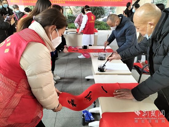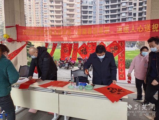 在銀海龍辰小區(qū),來自鄂州市書法協(xié)會的各位書法家現(xiàn)場“揮毫潑墨”,應(yīng)小區(qū)居民的要求,現(xiàn)場書寫春聯(lián)和“福”字。此次活動,共計為居民書寫贈送160副春聯(lián)、100幅“?!弊帧?/p>