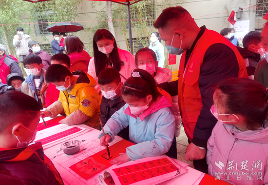 在寫春聯(lián)區(qū),書法志愿者現(xiàn)場(chǎng)揮毫潑墨題寫門福、新春及廉潔文化春聯(lián),同時(shí)引導(dǎo)小孩子共同參與寫“?!?,春節(jié)的氛圍感瞬間拉滿。短短半個(gè)小時(shí),小區(qū)廣場(chǎng)就掛滿了題寫好的春聯(lián)和門福。