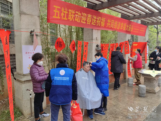 除了喜慶的春聯(lián),便民服務(wù)攤位也格外熱鬧。在現(xiàn)場(chǎng)志愿者及社工的引導(dǎo)下,社區(qū)老年協(xié)會(huì)志愿者現(xiàn)場(chǎng)為長者免費(fèi)理發(fā),為轄區(qū)老年居民感受到了社區(qū)的關(guān)心和愛護(hù)。