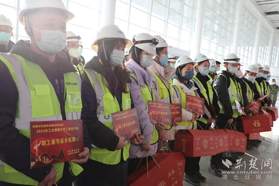 在鄂州花湖機(jī)場(chǎng)航站樓一樓大廳,現(xiàn)場(chǎng)氣氛熱烈,上午9時(shí),鄂州市總工會(huì)為乘機(jī)返鄉(xiāng)的首批60名建設(shè)者代表贈(zèng)送飛機(jī)票和年貨禮包,讓春節(jié)回家路更加溫暖、舒心、便捷。
