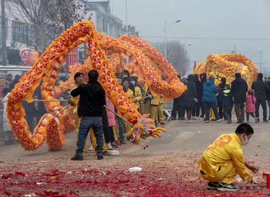 “舞一個(gè),舞一個(gè)!”舞龍隊(duì)每行進(jìn)一段距離,便會(huì)就地給老百姓來(lái)一段技藝高超的表演。師傅們舉著巨龍?jiān)谠茻衾锷舷麓┬校瑫r(shí)而騰起,時(shí)而俯沖,變化萬(wàn)千,配上歡快激昂的民間吹打樂(lè),一派喜慶熱烈的節(jié)日氛圍。