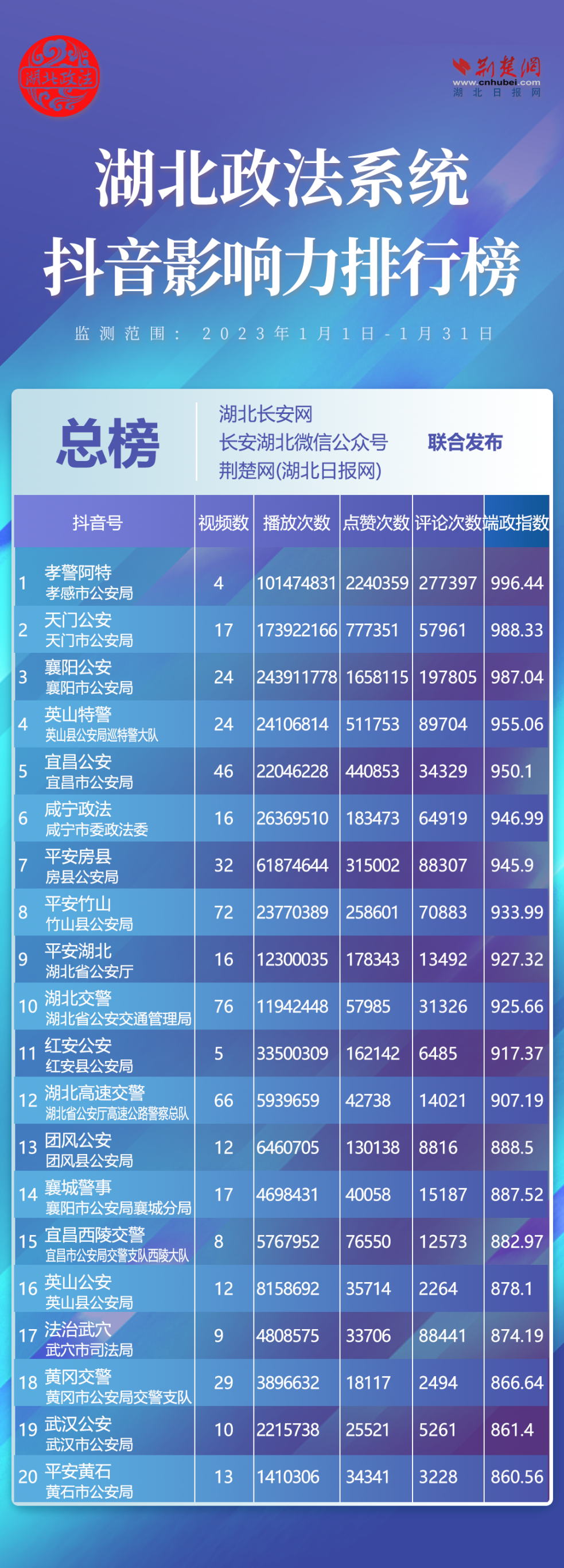 湖北政法系統(tǒng)370個抖音帳號參加評選,其中政法委系統(tǒng)82個、法院系統(tǒng)52個、檢察系統(tǒng)8個、公安系統(tǒng)195個、司法系統(tǒng)33個?!坝⑸教鼐?、“紅安公安”、“團風公安”、“英山公安”、“法治武穴”、“黃岡交警”6家單位強勢上榜,分別排名第4位、11位、13位、16位、17位、18位。