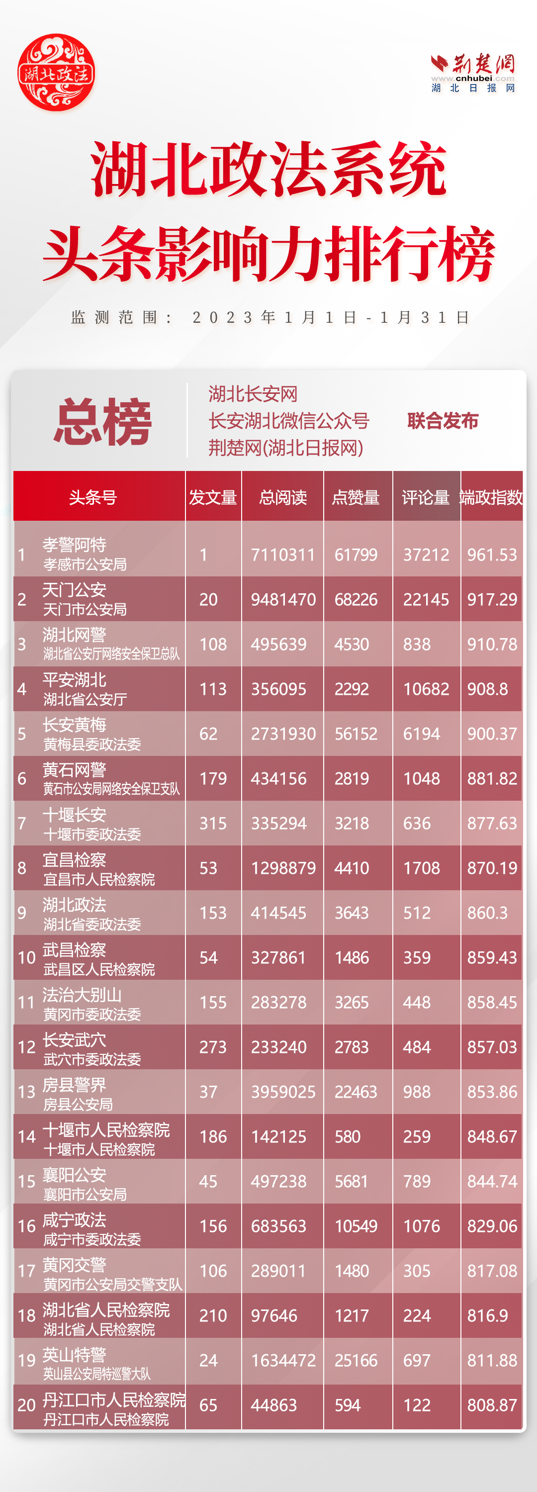 湖北政法系統(tǒng)681個頭條帳號參加評選,其中政法委系統(tǒng)123個、法院系統(tǒng)128個、檢察系統(tǒng)130個、公安系統(tǒng)141個、司法系統(tǒng)159個?!伴L安黃梅”、“法治大別山”、“長安武穴”、“黃岡交警”、“英山特警”5家單位強勢上榜,分別排名第5位、第11位、12位、17位、19位。