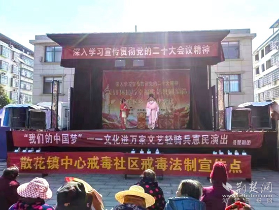 當(dāng)天,浠水縣楚劇團(tuán)到該村開展送戲下鄉(xiāng)活動(dòng),現(xiàn)場(chǎng)群眾絡(luò)繹不絕,浠水縣公安局禁毒大隊(duì)聯(lián)合散花鎮(zhèn)中心戒毒社區(qū)借活動(dòng)演出時(shí)機(jī),在現(xiàn)場(chǎng)開展毒品預(yù)防宣傳教育活動(dòng),共發(fā)放宣傳資料200余份,解答相關(guān)咨詢30余人。