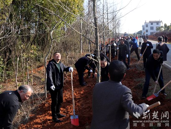 2月27日,在S360省道官埠段,春日暖陽,綠意盎然。咸寧市和咸安區(qū)200余名黨員干部正在揮揪植樹,1300棵株樹、香楓、紅櫸立馬成行,夾道迎賓。干群熱火朝天的干勁,恰似春風(fēng)撲面。