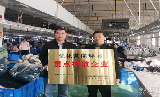 此前,英山縣紀委監(jiān)委“護航”行動專班在對全縣重點企業(yè)進行走訪時,湖北如普帽業(yè)有限公司反映該公司門口的“優(yōu)化營商環(huán)境重點護航企業(yè)”牌匾是2020年5月懸掛的,因常年風吹日曬,導致字跡斑駁不清。隨后,該縣紀委監(jiān)委將這一問題納入工作臺賬,立即協(xié)調(diào)重新制作牌匾,于是便有了開頭“換牌”的一幕,這也是該委深化“護航行動”的一個生動體現(xiàn)。