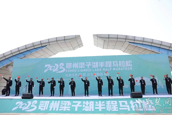 活動(dòng)現(xiàn)場(chǎng),中共鄂州市委書記孫兵,湖北省體育局二級(jí)巡視員胡晶珊,鄂州市人大副主任周秀華,鄂州市委常委、宣傳部部長鄒霞,鄂州市委常委、副市長盧輝,鄂州市副市長、公安局長方勇,鄂州市副市長邱實(shí),鄂州市政府黨組成員李梁軍共同為比賽鳴槍發(fā)令。一聲整齊的發(fā)令槍聲響徹云霄,打響了2023鄂州梁子湖半程馬拉松起跑的號(hào)角。