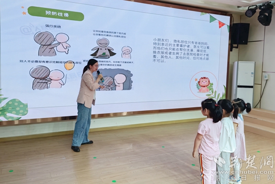 活動(dòng)中,杜航用一些發(fā)生在身邊鮮活、真實(shí)的典型事例,通俗易懂、深入淺出地講解了《未成年人保護(hù)法》中“家庭保護(hù)”“學(xué)校保護(hù)”“社會(huì)保護(hù)”和“司法保護(hù)”的相關(guān)內(nèi)容。用幼兒容易理解的小視頻和故事進(jìn)行防性侵、防拐騙、防溺水等方面的安全教育,機(jī)智的問答互動(dòng),讓孩子們?cè)跉g聲笑語中學(xué)到了知識(shí),懂得了如何保護(hù)自己。