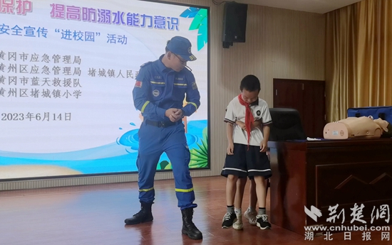 走進(jìn)堵城小學(xué),來(lái)自黃岡市藍(lán)天救援隊(duì)的專業(yè)講師正向同學(xué)們宣傳防溺水安全知識(shí),對(duì)突發(fā)溺水應(yīng)急處置、心肺復(fù)蘇術(shù)等自救互救技能進(jìn)行了演示。