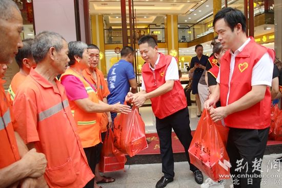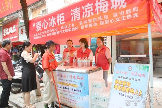 荊楚網(wǎng)(湖北日?qǐng)?bào)網(wǎng))訊(通訊員 曹競(jìng)帆 張萍)“這個(gè)愛(ài)心大禮包太實(shí)用了?!?月19日,在黃梅縣“愛(ài)心冰柜 清涼梅城”新時(shí)代文明實(shí)踐志愿服務(wù)活動(dòng)啟動(dòng)儀式上,拿到裝有水果罐頭、綠豆的防暑降溫禮包后,該縣黃梅鎮(zhèn)環(huán)衛(wèi)工人吳大姐微笑著豎起大拇指,“有了這些‘愛(ài)心冰柜’,我和工友們以后補(bǔ)水就很方便了!”