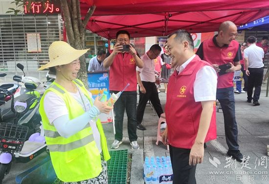“歡迎到獻(xiàn)血車(chē)納涼歇腳,不獻(xiàn)血也可以免費(fèi)飲用礦泉水?!被顒?dòng)當(dāng)天,見(jiàn)一名環(huán)衛(wèi)工人在獻(xiàn)血車(chē)旁駐足觀望,身穿志愿服務(wù)馬甲的紅安縣衛(wèi)健局副局長(zhǎng)蔡霖快步上前,遞上水和果汁。