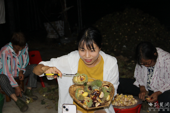 28日晚8時(shí),與“谷哥”直播現(xiàn)場(chǎng)數(shù)里的大河鎮(zhèn)涼亭村,也是一片火熱。去年從深圳返鄉(xiāng)從事助農(nóng)直播的何婷也正在直播賣板栗,丈夫在一旁忙著收購(gòu)村民連夜送來的板栗,婆婆就在直播鏡頭前剝板栗,一家人忙得團(tuán)團(tuán)轉(zhuǎn)。