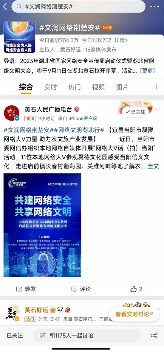 記者梳理發(fā)現(xiàn),9月10日上午,在微博平臺上,由湖北省正能量網(wǎng)絡(luò)大V“黃石好運(yùn)”發(fā)起上述討論話題。平臺數(shù)據(jù)顯示,當(dāng)天相關(guān)話題閱讀量超過4000萬人次,全省已有15家媒體平臺,包括荊楚網(wǎng)、湖北發(fā)布、長江日報(bào)、武漢發(fā)布、宜昌發(fā)布、黃石廣播電視臺等官方平臺賬號參與話題接力、轉(zhuǎn)發(fā)。不少網(wǎng)友紛紛參與評論互動(dòng)。