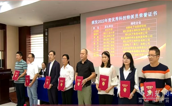 活動(dòng)現(xiàn)場(chǎng),9名黃石市2022年度優(yōu)秀“企業(yè)科技特派員”站上領(lǐng)獎(jiǎng)臺(tái)。其中,湖北理工學(xué)院優(yōu)秀“企業(yè)科技特派員”占了三分之二。