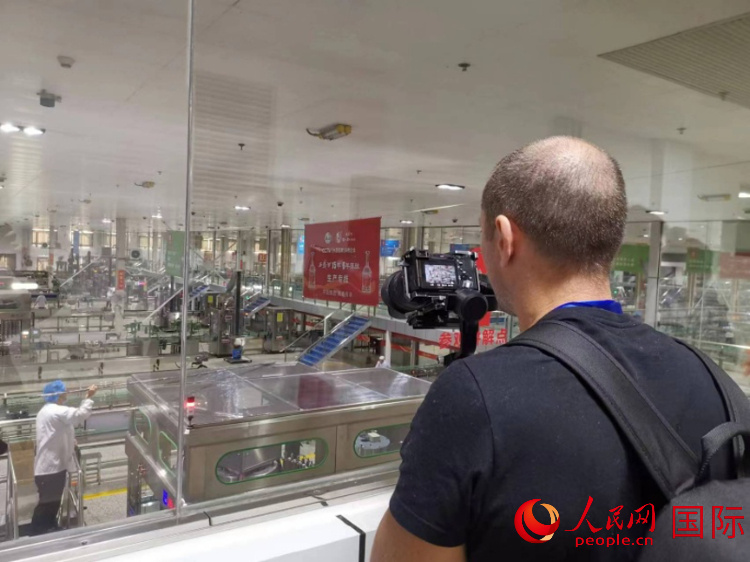 | 俄羅斯金磚電視臺(tái)攝像師帕維爾·波洛溫卡拍攝西鳳酒現(xiàn)代化生產(chǎn)車間。人民網(wǎng)記者 楊倩攝 |