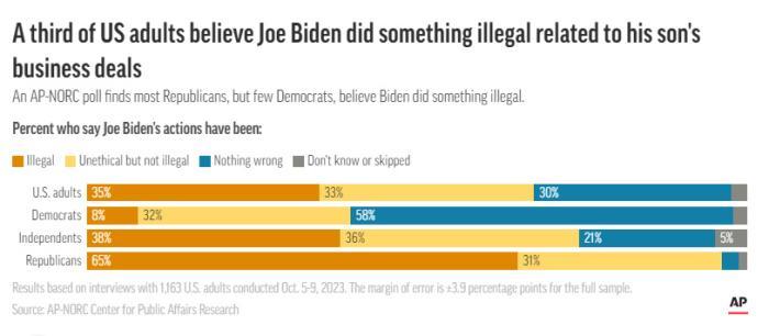 據美聯(lián)社報道,NORC公共事務研究中心的最新民調顯示,68%的受訪者認為拜登與其子亨特?拜登處理海外商業(yè)交易的方式不道德或非法,其中33%的人認為不道德,35%的人認為非法。