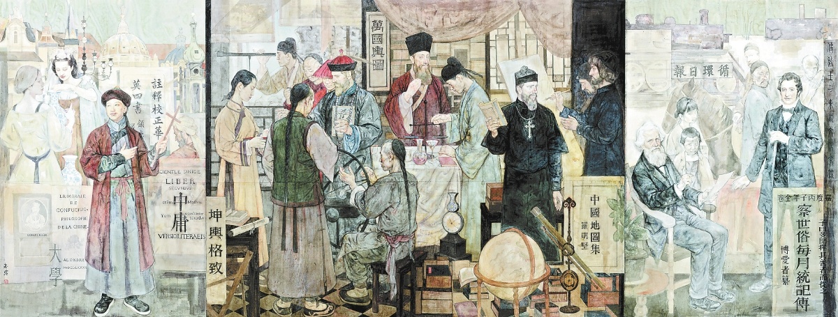 作為“一帶一路”國際美術(shù)工程的入選作品,《傳教士與東西方文化交流》也是盧志強傾力創(chuàng)作的一幅畫作。在這幅畫中,他讓眾多歷史人物跨時空相會,包括羅明堅、利瑪竇、徐光啟、湯若望、沈福宗、郎世寧、伏爾泰等,他們都曾在中外文化交流中起到重要的作用,是西學(xué)東漸、東學(xué)西漸的傳播者和宣傳者。