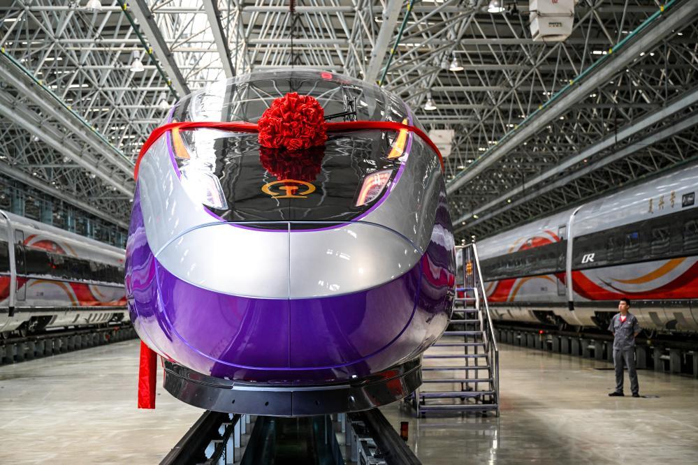 這是7月21日在中車長(zhǎng)春軌道客車股份有限公司拍攝的復(fù)興號(hào)亞運(yùn)智能動(dòng)車組外觀。 新華社記者 顏麟蘊(yùn) 攝