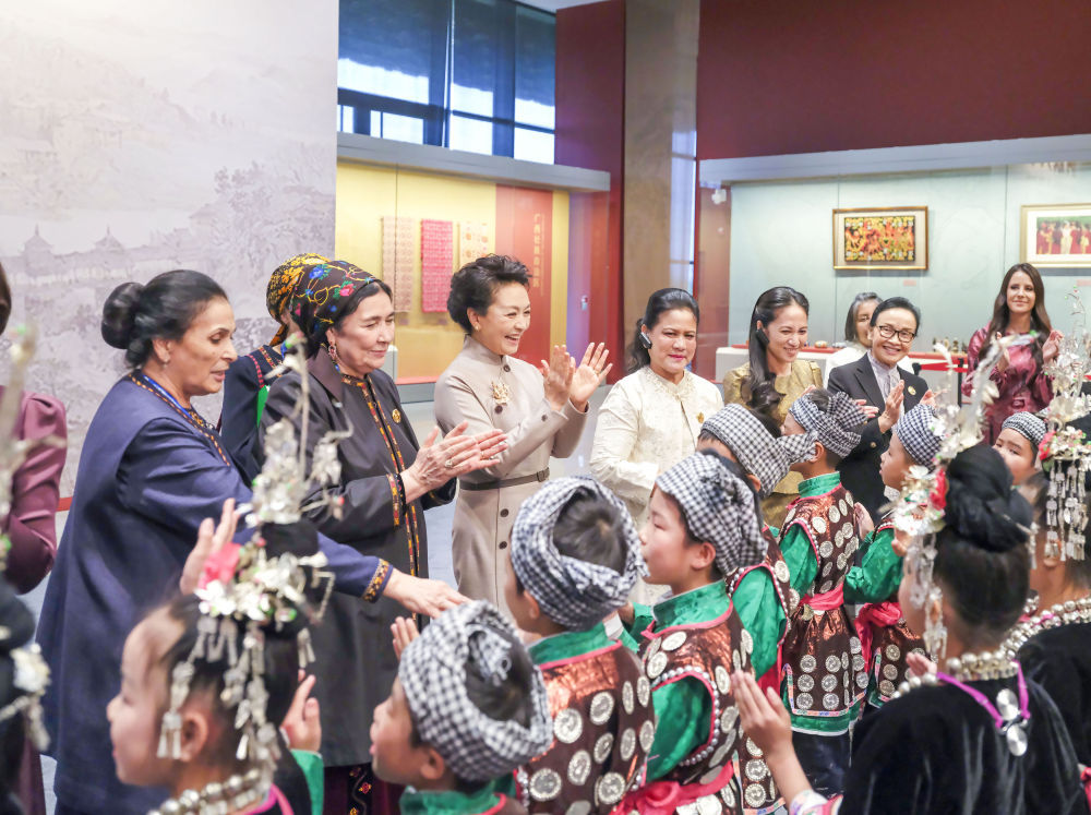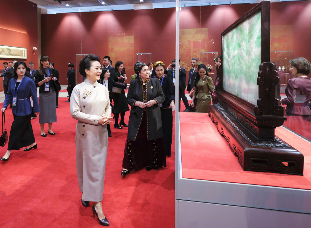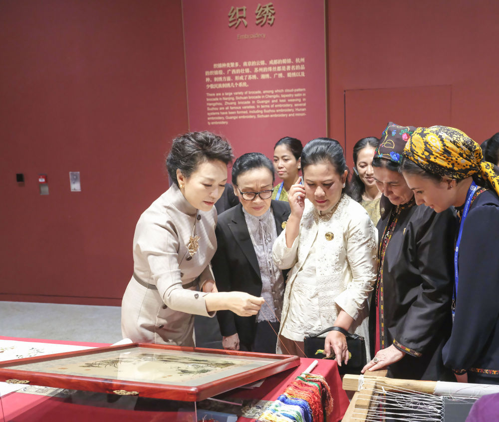 10月18日上午,國家主席習近平夫人彭麗媛邀請出席第三屆“一帶一路”國際合作高峰論壇的外方領(lǐng)導(dǎo)人夫人參觀中國工藝美術(shù)館(中國非物質(zhì)文化遺產(chǎn)館)。