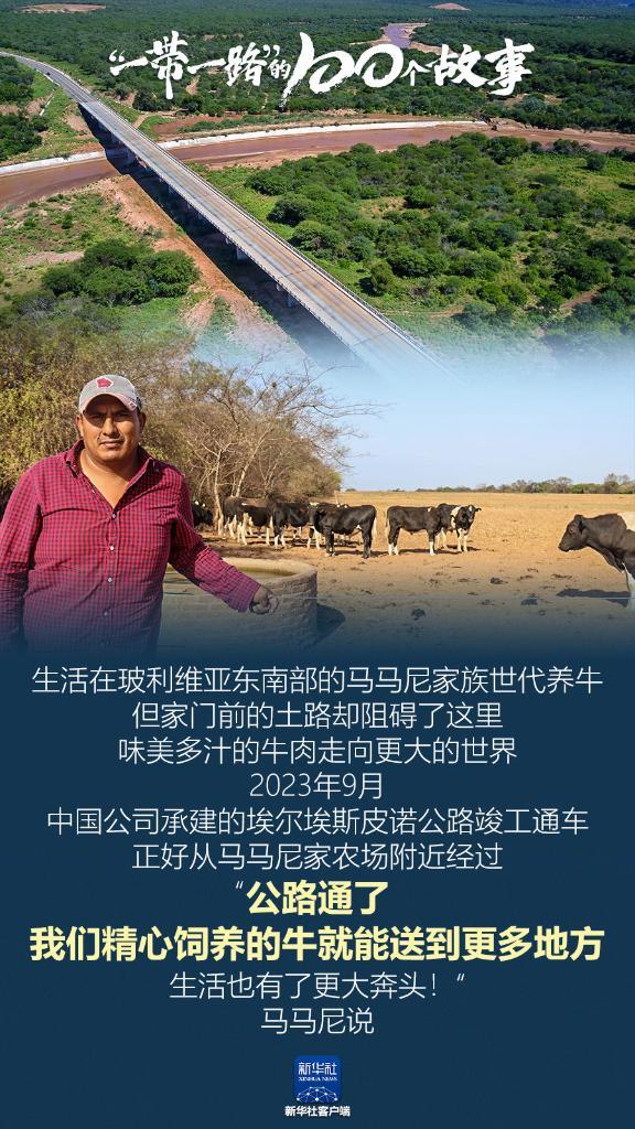生活在玻利維亞東南部的馬馬尼家族世代養(yǎng)牛,但家門前的土路卻阻礙了這里味美多汁的牛肉走向更大的世界。2023年9月,中國公司承建的埃爾埃斯皮諾公路竣工通車,正好從馬馬尼家農(nóng)場附近經(jīng)過?!肮吠?,我們精心飼養(yǎng)的牛就能送到更多地方,生活也有了更大奔頭!”馬馬尼說。(記者:郝云甫、吳昊)