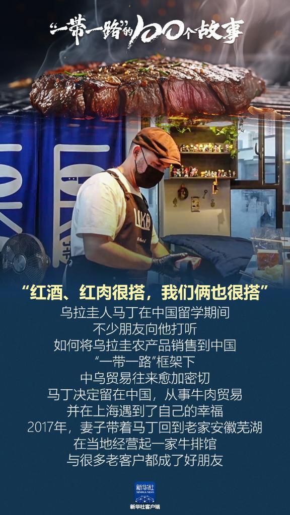 “紅酒、紅肉很搭,我們倆也很搭?!睘趵缛笋R丁在中國留學期間,不少朋友向他打聽如何將烏拉圭農(nóng)產(chǎn)品銷售到中國。“一帶一路”框架下,中烏貿(mào)易往來愈加密切。馬丁決定留在中國,從事牛肉貿(mào)易,并在上海遇到了自己的幸福。2017年,妻子帶著馬丁回到老家安徽蕪湖,在當?shù)亟?jīng)營起一家牛排館,與很多老客戶都成了好朋友。(記者:戴威)