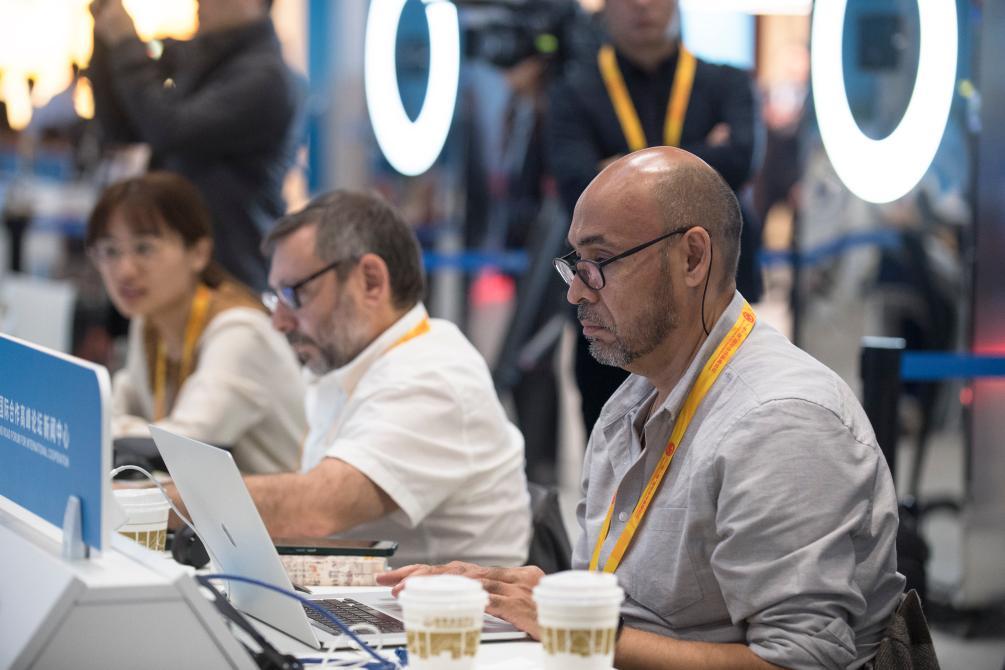 10月17日,記者在“一帶一路”國(guó)際合作高峰論壇新聞中心工作。新華社記者 張豪夫 攝