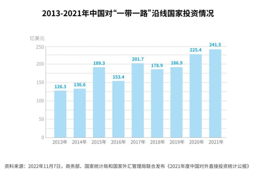 截至2021年底,中國(guó)在“一帶一路”沿線國(guó)家設(shè)立企業(yè)超過(guò)1.1萬(wàn)家,約占中國(guó)境外企業(yè)總量的1/4。2021年,對(duì)“一帶一路”沿線國(guó)家直接投資241.5億美元,創(chuàng)歷史新高,占中國(guó)全年對(duì)外投資流量總額的13.5%;年末存量2138.4億美元,占存量總額的7.7%。[16]