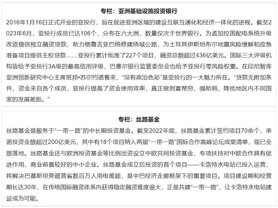 共建“一帶一路”積極開拓多元化、多層次融資渠道,為新興經(jīng)濟(jì)體和發(fā)展中國(guó)家經(jīng)濟(jì)增長(zhǎng)“輸血”。亞洲基礎(chǔ)設(shè)施投資銀行(亞投行)、絲路基金、中國(guó)開發(fā)性和政策性銀行及商業(yè)金融機(jī)構(gòu),與世界銀行、歐洲復(fù)興開發(fā)銀行、亞洲開發(fā)銀行等多邊開發(fā)機(jī)構(gòu)以及國(guó)際和本地金融機(jī)構(gòu)積極合作,形成透明、高效、互利的共建“一帶一路”投融資朋友圈。
