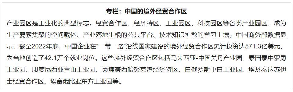 共建“一帶一路”國(guó)家的產(chǎn)業(yè)合作,推動(dòng)并強(qiáng)化了這一趨勢(shì)。中泰新絲路塔吉克斯坦農(nóng)業(yè)紡織產(chǎn)業(yè)園,幫助當(dāng)?shù)貜拿藁ǚN植向棉紡織全產(chǎn)業(yè)鏈跨越。印度尼西亞摩洛哇麗縣的青山工業(yè)園區(qū),將曾經(jīng)偏僻的小漁村變成了全球重要的鎳礦開采冶煉和不銹鋼產(chǎn)業(yè)基地,助力印尼“從賣30美元/噸鎳原礦到賣2300美元/噸不銹鋼”。在埃及泰達(dá)蘇伊士經(jīng)貿(mào)合作區(qū),巨石玻璃纖維公司建成年產(chǎn)20萬(wàn)噸玻璃纖維生產(chǎn)線,令埃及成為全球第四大玻纖生產(chǎn)和貿(mào)易國(guó),吸引大量上下游企業(yè)赴埃投資。