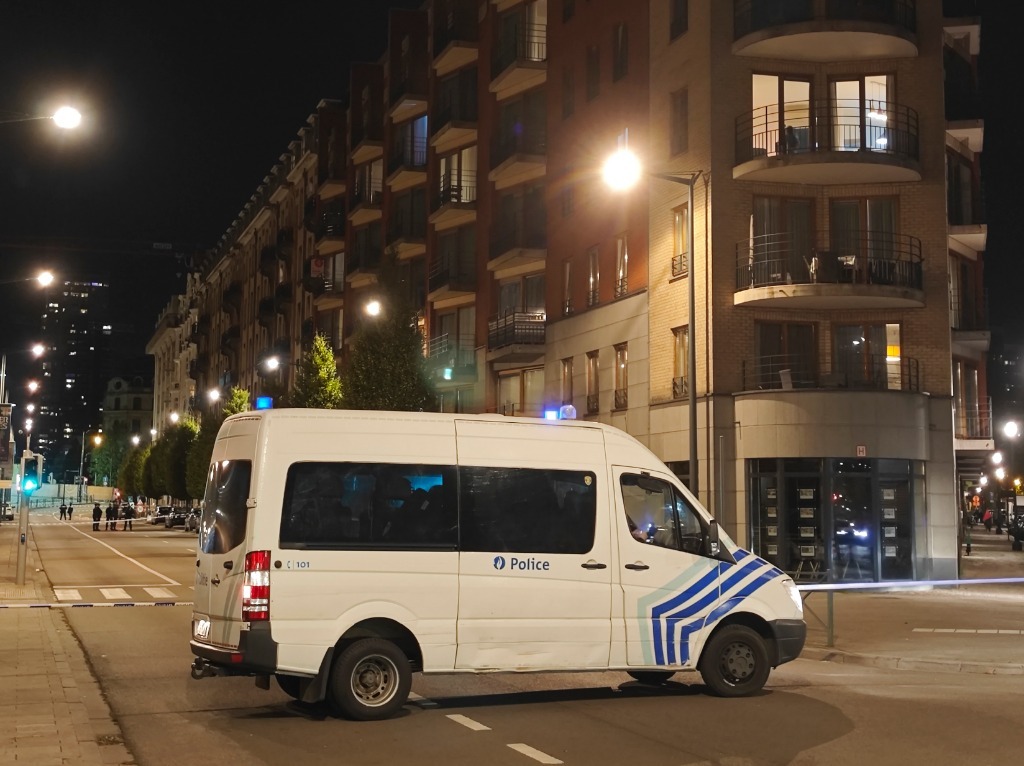 10月16日,在比利時布魯塞爾,警方在槍擊事件現(xiàn)場警戒。新華社記者劉宇軒攝