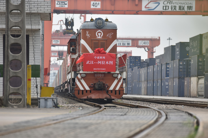 2021年5月20日,開往哈薩克斯坦阿拉木圖的班列在武漢吳家山站整裝待發(fā)。這是吳家山站開出的第一列中亞班列,也是武漢首次開行至哈薩克斯坦的中亞班列。新華社發(fā)(彭琦攝)