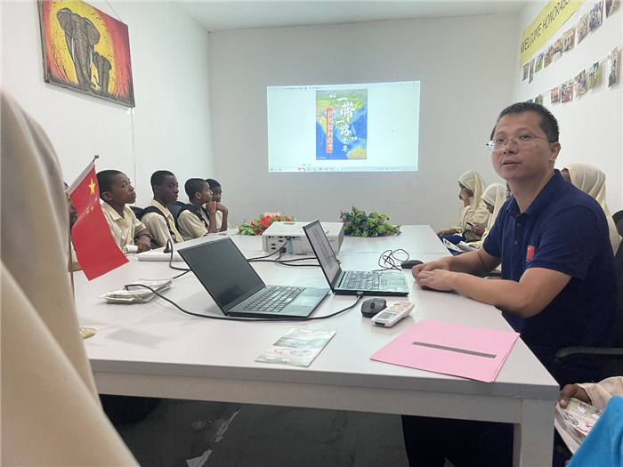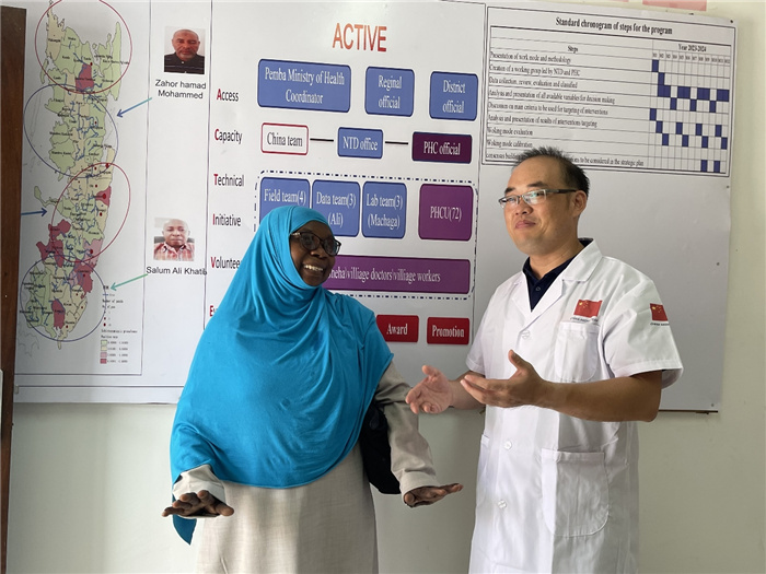 | 何明禎介紹“一帶一路”。中國援桑給巴爾血吸蟲病防治組供圖 |