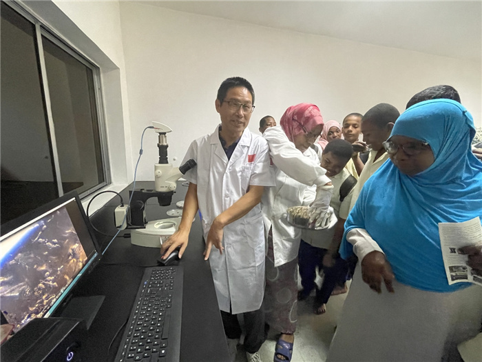 活動中,專家組成員吳洪初指導孩子們使用顯微鏡觀察蟲卵形態(tài),開展樣本檢測,專家組成員王鑫瑤詳細講解了血吸蟲生活史和預防控制知識,演示了血吸蟲各個階段的生物學形態(tài)。五年級的學生阿伊莎曾經(jīng)也是血吸蟲病患者,經(jīng)過中國專家治療后重返校園,這是她第一次參加這樣的科普活動,在了解了自己的國家仍然飽受血吸蟲病困擾后,她表示要努力學好知識和本領,為家鄉(xiāng)血吸蟲病消除和疾病控制貢獻力量。