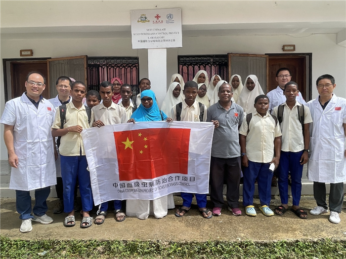 | 學生們與專家組合影。中國援桑給巴爾血吸蟲病防治組供圖 |