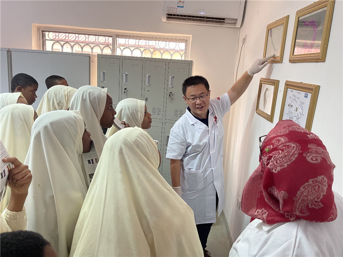 | 王鑫瑤介紹“血吸蟲生活史”。中國援桑給巴爾血吸蟲病防治組供圖 |