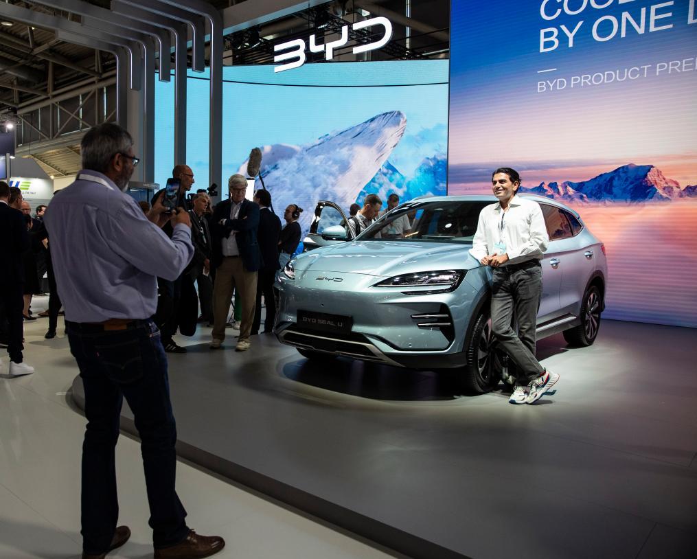 9月4日,在德國(guó)慕尼黑國(guó)際車(chē)展媒體預(yù)展上,參觀者在比亞迪品牌發(fā)布會(huì)現(xiàn)場(chǎng)與BYD SEAL U汽車(chē)合影。新華社記者 張帆 攝