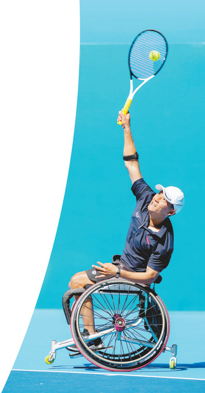 杭州亞殘運(yùn)會(huì)輪椅網(wǎng)球男子單打比賽,中國體育代表團(tuán)運(yùn)動(dòng)員董順江在比賽中。記者 厲衍飛攝