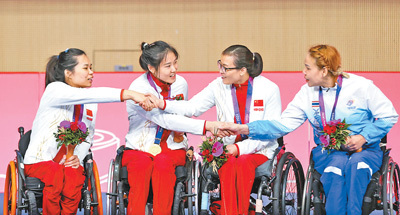 杭州亞殘運(yùn)會(huì)輪椅擊劍女子花劍個(gè)人B級(jí)決賽,中國體育代表團(tuán)運(yùn)動(dòng)員和泰國體育代表團(tuán)運(yùn)動(dòng)員(右)在頒獎(jiǎng)儀式上握手致意。新華社記者 胡星宇攝
