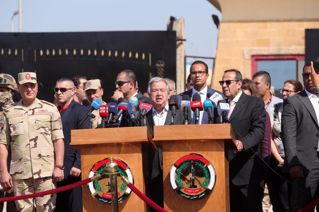 10月20日,在拉法口岸埃及一側(cè),聯(lián)合國(guó)秘書(shū)長(zhǎng)古特雷斯(中)發(fā)表講話。新華社發(fā)(艾哈邁德·戈馬攝)