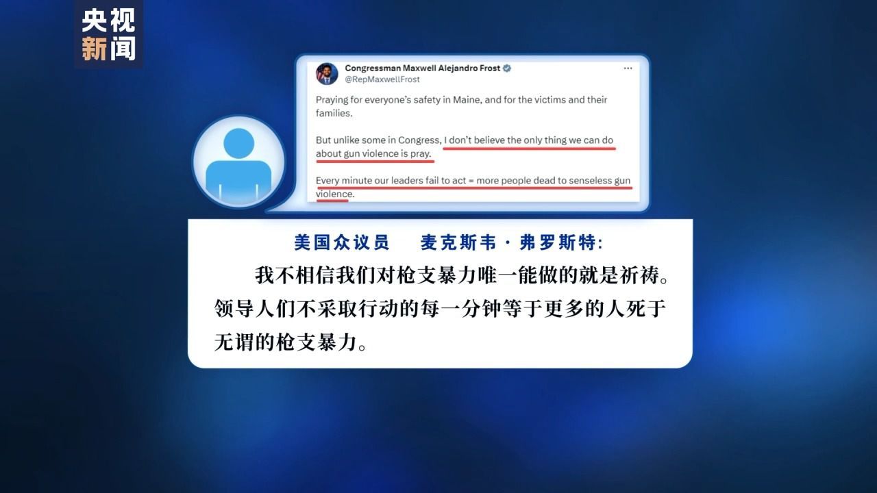 美國全國廣播公司主持人 琳賽·賴澤:許多控槍派人士將此次大規(guī)模槍擊案的發(fā)生歸結(jié)于緬因州控槍立法不力。他們呼吁頒布突擊步槍禁令,并對(duì)所有槍支銷售進(jìn)行背景審查。
