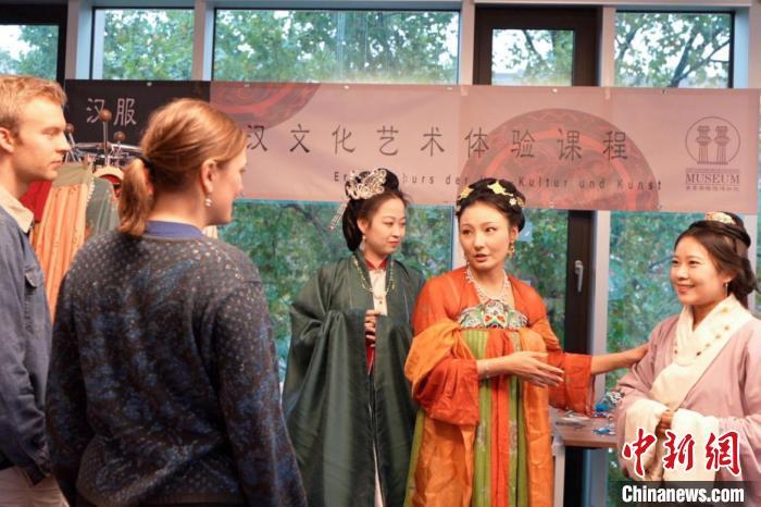 圖為活動講師為德國學(xué)生介紹漢制漢服特點。漢文化藝術(shù)交流中心供圖。